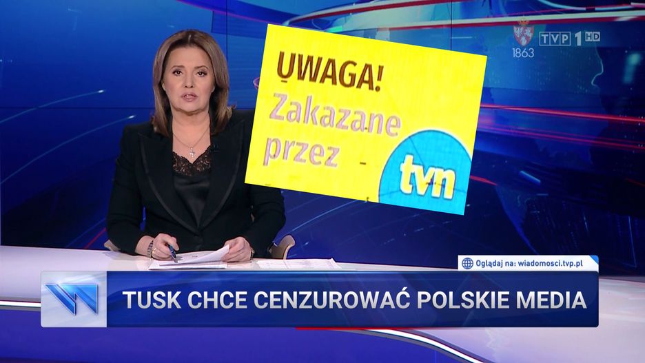 W poniedziałkowych "Wiadomościach" TVP pojawił się materiał informujący o akcji protestacyjnej z wymownym hasłem: "TVN i Tusk nie zamknie nam ust". Przez kilka minut zarzucano na antenie szefowi PO i wspomnianej stacji "cenzorskie zapędy" i "próbę ograniczenia wolności słowa". Ani razu nie wspomniano jednak o skandalu z filmem obnażającym działanie komisji Macierewicza.