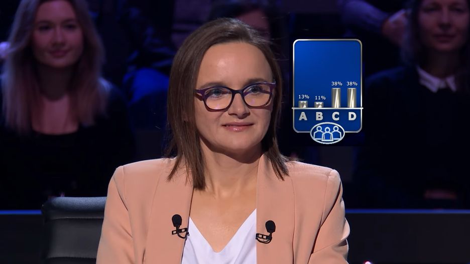 To pytanie również zabiło jej ćwieka. Po chwili namysłu Anna zdecydowała się poprosić o pomoc publiczność. Niestety większość widowni również nie znała właściwej odpowiedzi. Co gorsza, na dwa warianty zagłosowała taka sama liczba osób (po 38 proc.). W tej sytuacji Anna postanowiła nie kusić losu i wycofała się z dalszej gry z kwotą 125 tys. Zł. Właściwą odpowiedzią było c) z przegródkami.