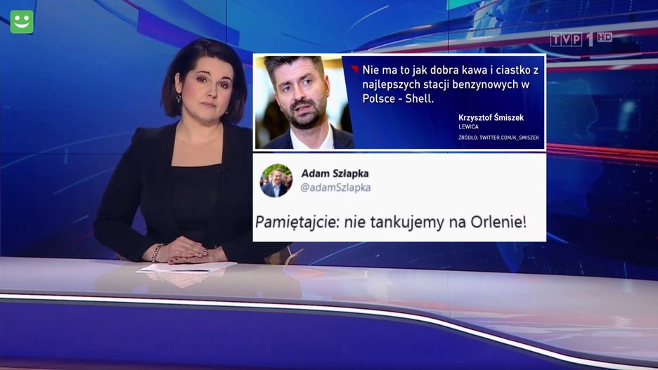 Następnie "Wiadomości" pokazały widzom wpis na Twitterze Adama Szłapki z Nowoczesnej. "Pamiętajcie: nie tankujemy na Orlenie!" – apelował poseł opozycji.