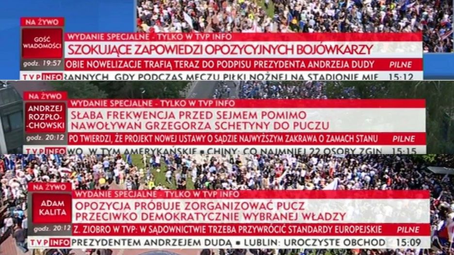 Gorące dyskusje wzbudzały także paski pokazywane w trakcie relacji z manifestacji przeciw uchwalanym w parlamencie ustawom reformującym system sądowniczy. Chodzi m.in. o komunikat mówiący iż Grzegorz Schetyna namawia do puczu, i komentarz do relacji z 17 lipca "obrońcy pedofilów i alimenciarzy twarzami oporu przeciwko reformie sądownictwa" (w tym przypadku wpłynęły cztery skargi). W zażaleniach oceniono jasno – tego typu materiały są nierzetelne, stronnicze i wprowadzające w błąd widzów.