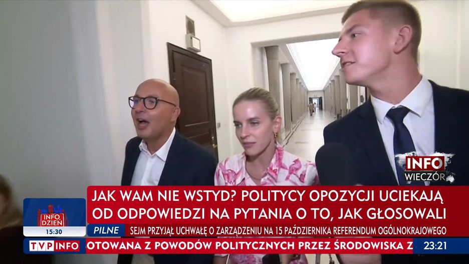 - Posłowie opozycji, a zwłaszcza Platformy Obywatelskiej, nie chcą odpowiadać, w jaki sposób głosowali w sprawie podwyższenia wieku emerytalnego czy budowy zapory na granicy z Białorusią - mówiła prezenterka TVP Info w programie "Info wieczór". Po tych słowach wyemitowano kuriozalne nagranie z Sejmu, gdzie dwójka młodych pracowników stacji dosłownie goniła posłów opozycji, by zadać jedno pytanie: "Czy nie jest panu/pani wstyd?".